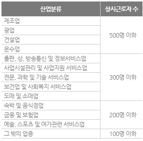 우선지원 기업 : 산업별 상시 근로자 수 기준 상이